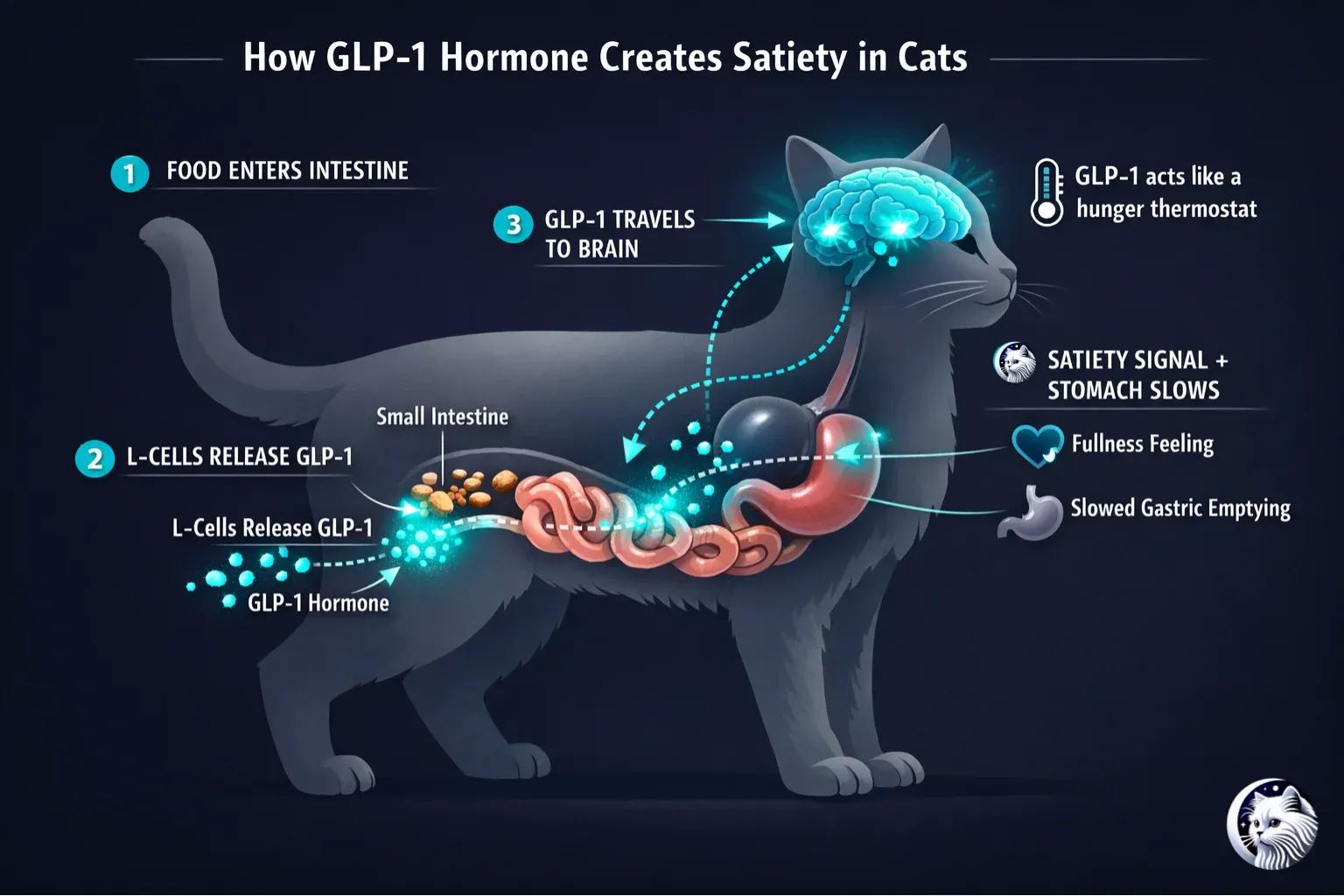 GLP-1 (Glucagon-Like Peptide-1) is an incretin hormone released by intestinal L-cells in response to nutrient intake that signals satiety to the brain, slows gastric emptying, and enhances insulin sensitivity. In cats, GLP-1 is stimulated by glucose just as in humans—contrary to some misinformation suggesting cats respond differently. The incretin that behaves unusually in cats is GIP (glucose-dependent insulinotropic polypeptide), which responds primarily to amino acids and fat rather than glucose. GLP-1 itself functions similarly across species.