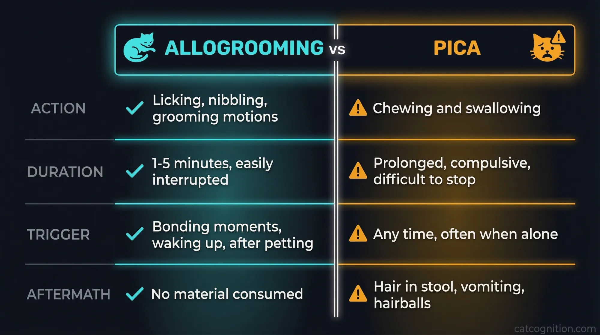 The CatCog Reality Check: Self-soothing grooming is not inherently problematic. It becomes a concern when the behavior is compulsive—when your cat seems unable to stop, grooms until they cause bald patches (on themselves), or becomes distressed when they cannot access your hair.