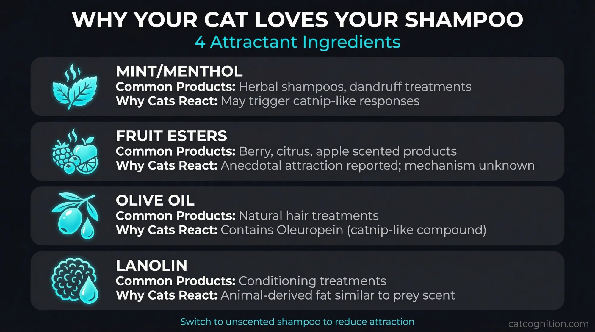 | Mint/Menthol | Herbal shampoos, dandruff treatments | May trigger catnip-like responses in some cats (anecdotal; not chemically identical to Nepetalactone) |