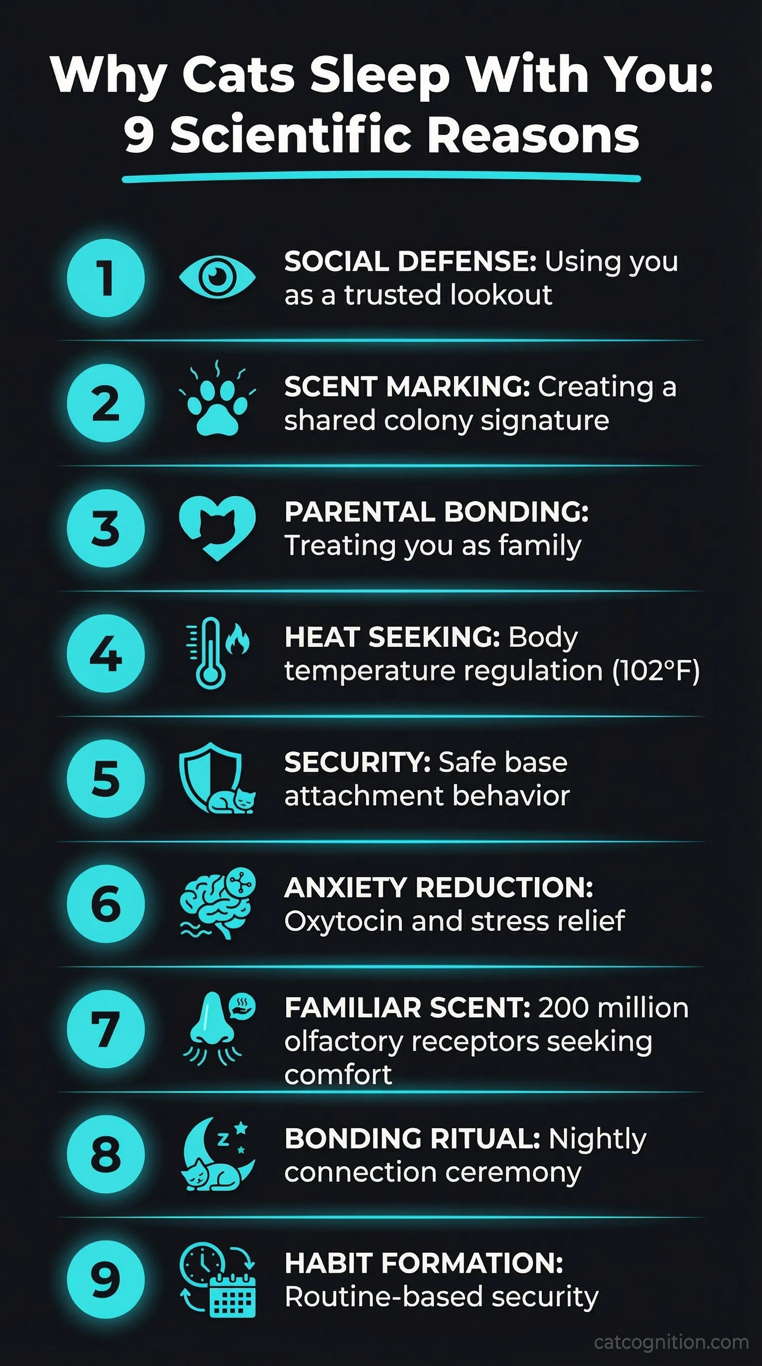 When cats sleep with you, it signals deep trust. Beyond warmth-seeking (cats run 102°F), they use you for Social Defense, scent bonding, and secure attachment. Here are the 9 biological drivers.