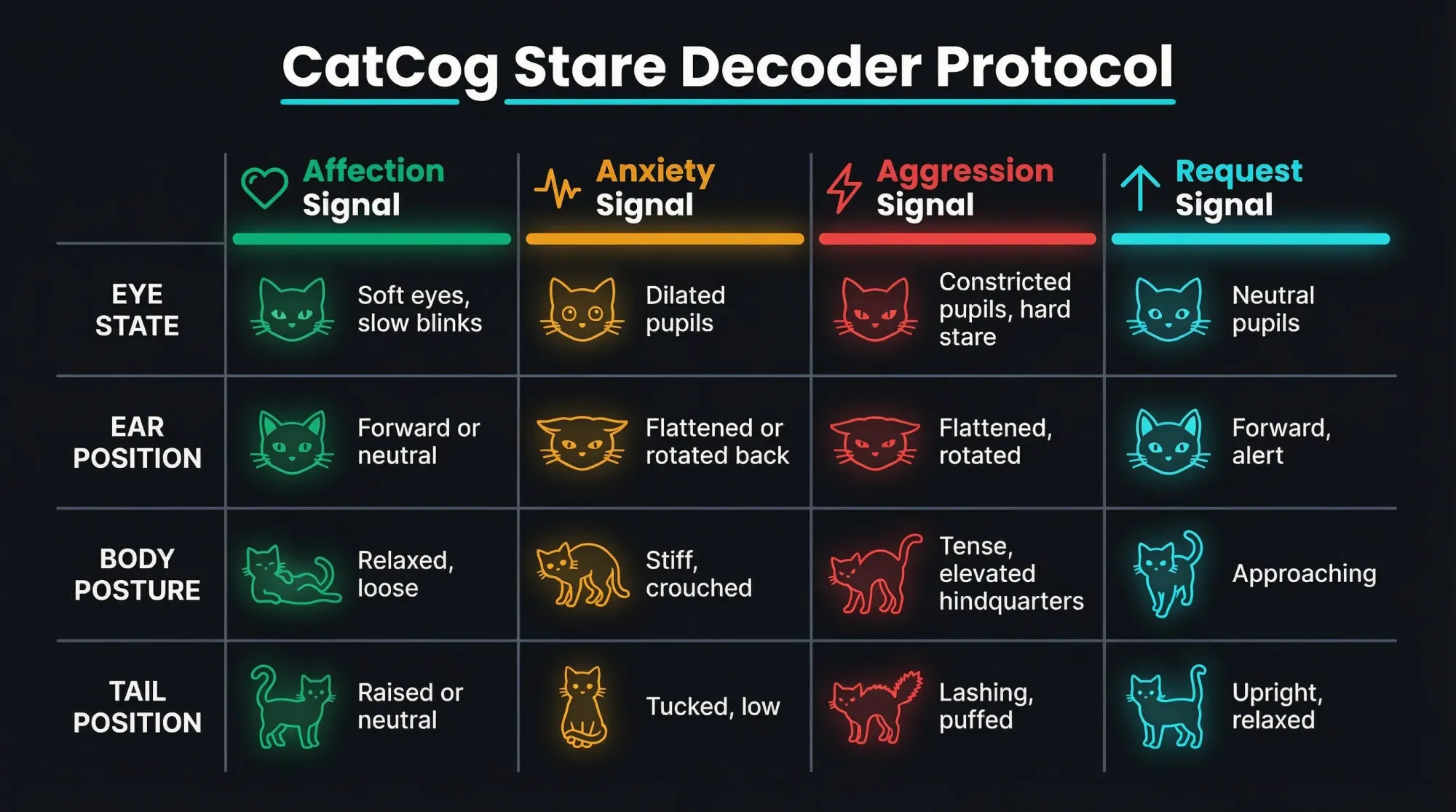 The CatCog Stare Decoder Protocol provides a systematic framework for interpreting cat watching behavior by examining four body language factors simultaneously. No single signal tells the complete story—context determines meaning.