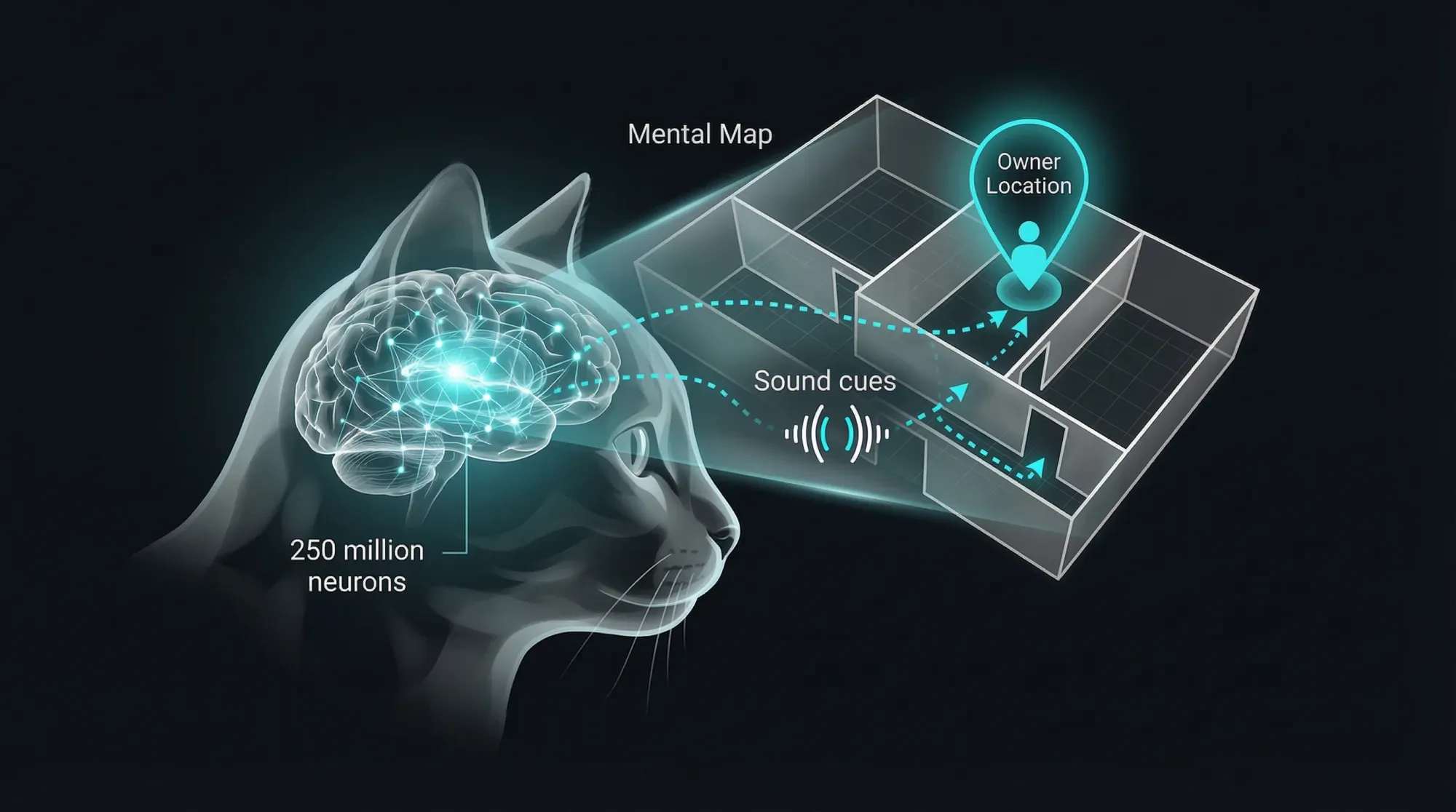 Think of a cat's mental map like a GPS tracker running constantly in the background. Even when you leave the room, your cat's brain continues plotting your estimated location based on sound cues until visual confirmation resumes. The cat cerebral cortex contains approximately 250 million neurons, enabling this complex cognitive processing and mental modeling of owner behavior.